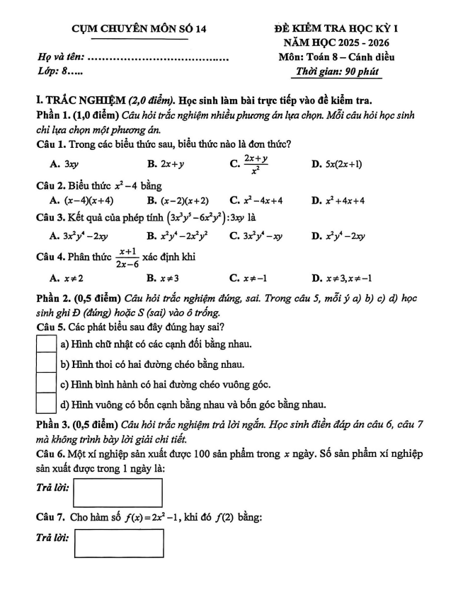 Đề học kỳ 1 Toán 8 năm 2025 – 2026 cụm chuyên môn số 14 – Hà Nội 26/12/2025