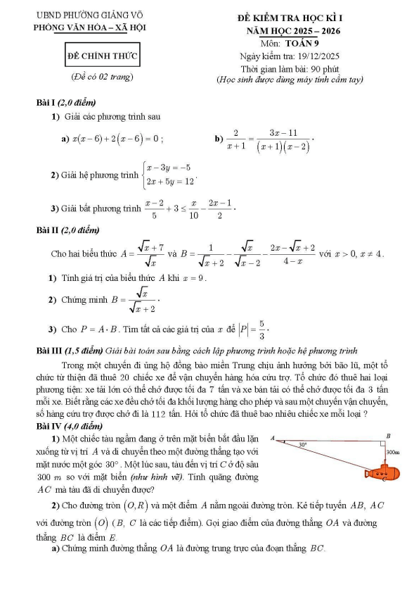 Đề học kì 1 Toán 9 năm 2025 – 2026 phường Giảng Võ – Hà Nội 19/12/2025