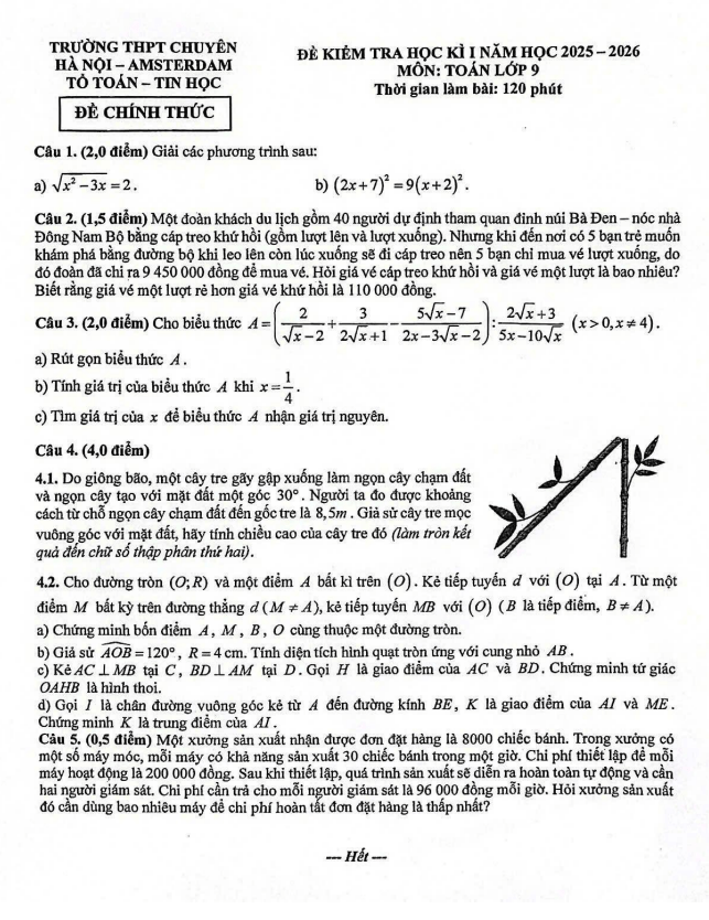 Đề học kì 1 Toán 9 năm 2025 – 2026 trường THPT chuyên Hà Nội – Amsterdam 19/12/2025