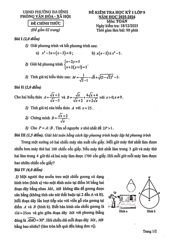 Đề học kỳ 1 Toán 9 năm 2025 – 2026 phường Ba Đình – Hà Nội 19/12/2025