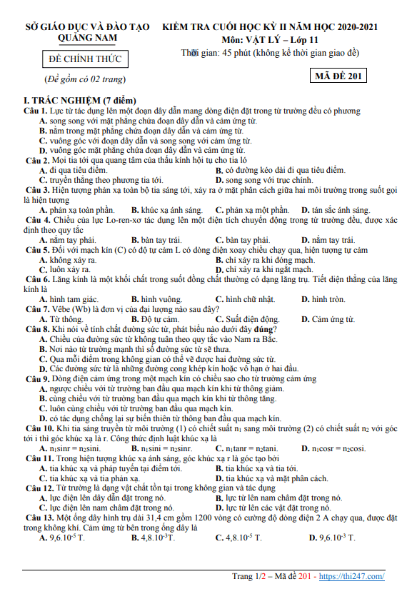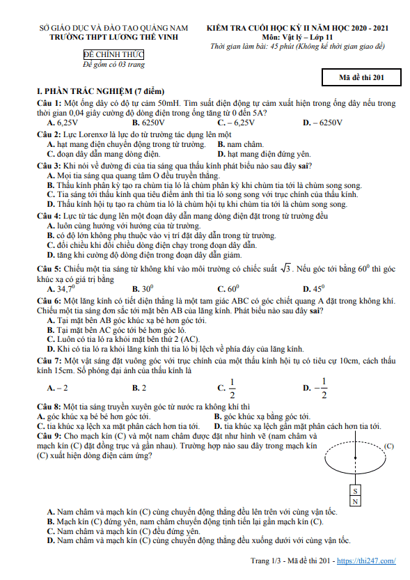 9 Đề Thi Học Kì 2 Môn Vật Lý Lớp 11 Năm 2020 - 2021 Chọn Lọc Có đáp ...