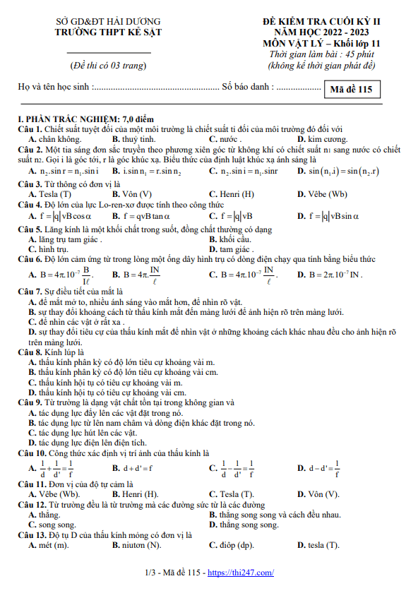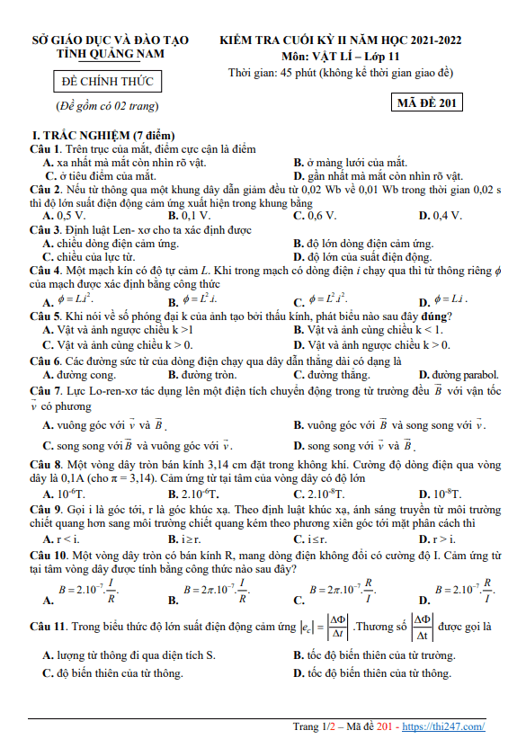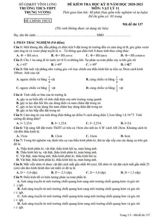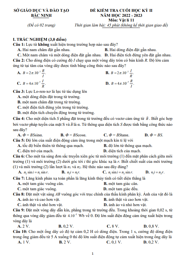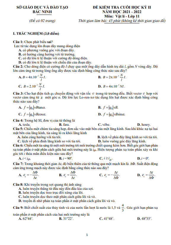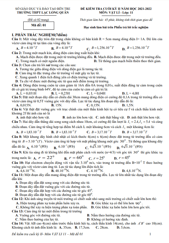 Đề Thi Vật Lí 11 Học Kì 2 Năm 2021 - 2022 Có đáp án (30 đề)