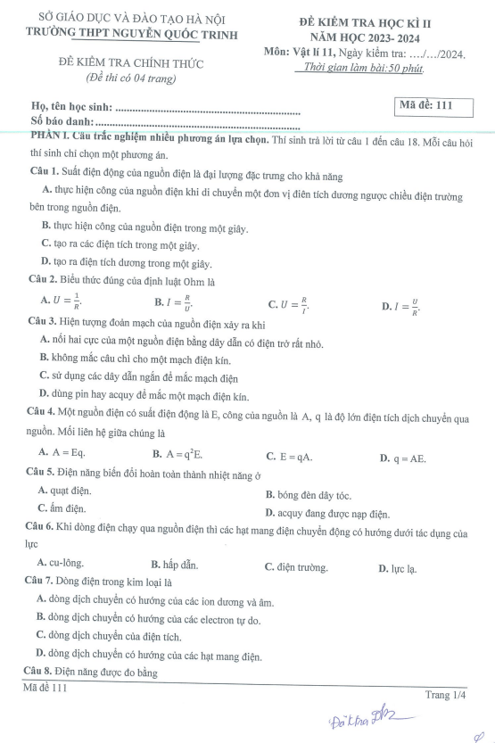 Đề Thi Học Kì 2 Lớp 11 Môn Lý - DeThiHsg247.Com