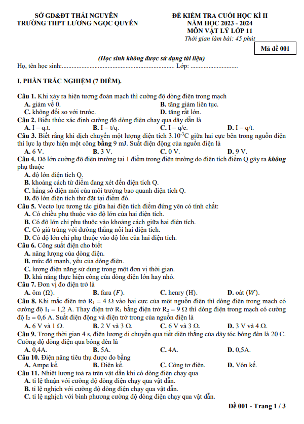 Đề Kiểm Tra Vật Lý 11 | Thư Viện Vật Lý