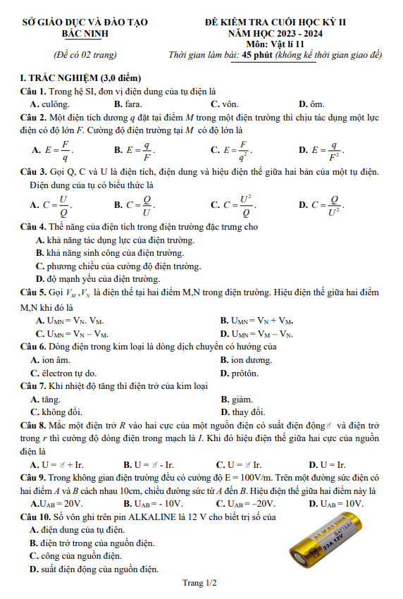 Top 100 Đề Thi Vật Lí Lớp 11 Chọn Lọc Năm 2021 - 2022 Có đáp án