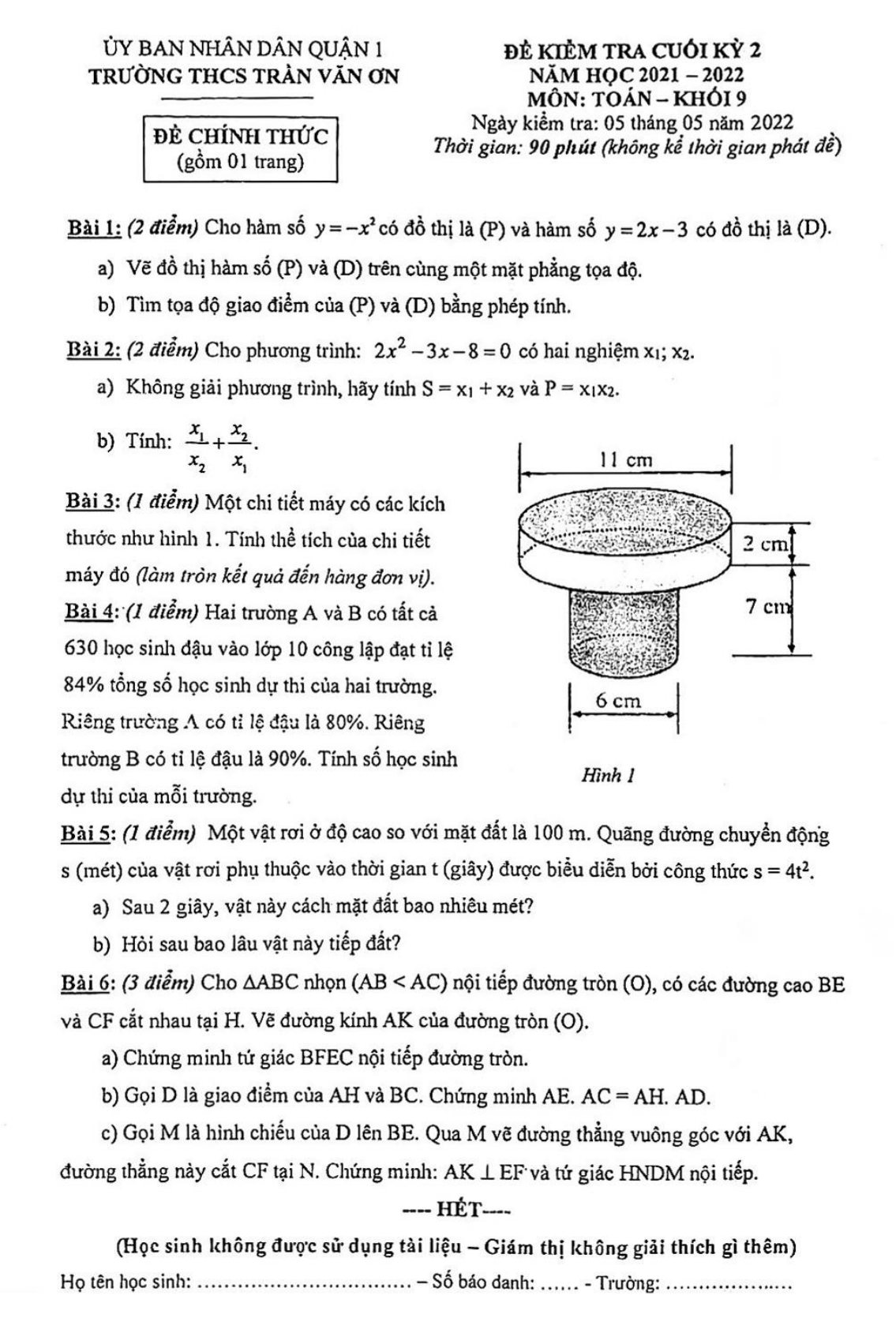 Đề kiểm tra học kì 2 lớp 9 môn Toán trường THCS Trần Văn Ơn, TP HCM năm học 2021-2022