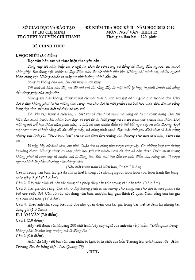 Đề thi HK2 Ngữ Văn 12 năm 2018 – 2019 trường THPT Nguyễn Chí Thanh – TP HCM