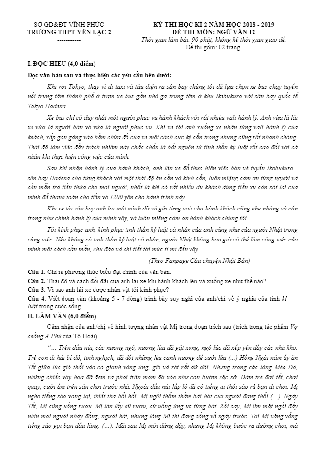 Đề thi học kì 2 Ngữ Văn 12 năm 2018 – 2019 trường Yên Lạc 2 – Vĩnh Phúc