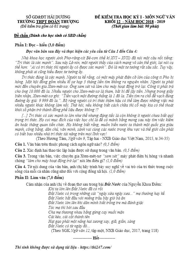 Đề thi HK1 Ngữ Văn 12 năm 2018 – 2019 trường THPT Đoàn Thượng – Hải Dương