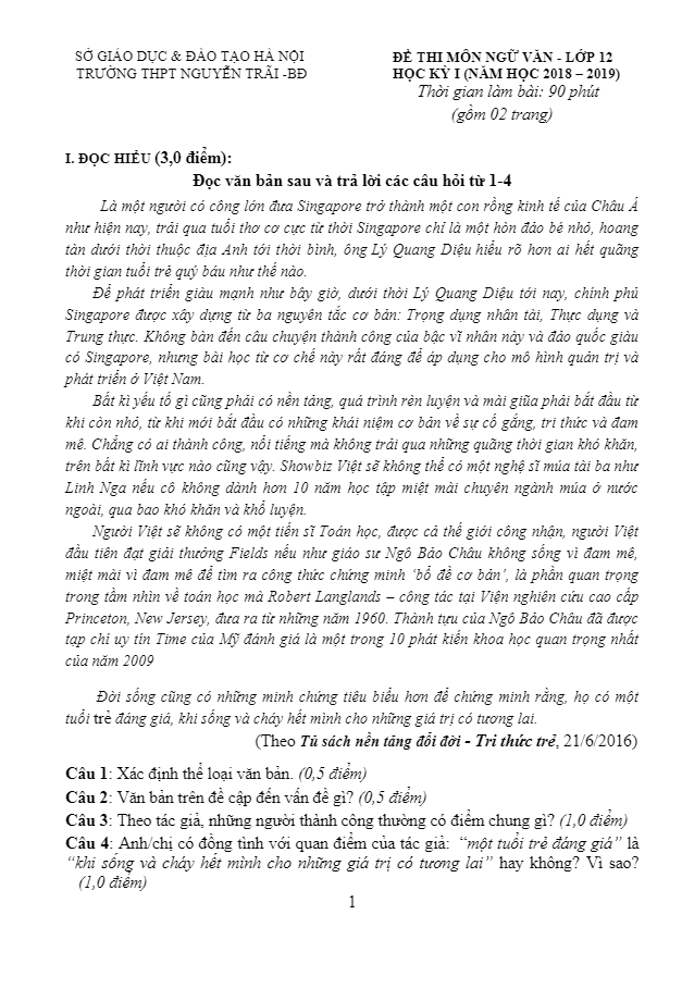 Đề thi HK1 Ngữ Văn 12 năm 2018 – 2019 trường THPT Nguyễn Trãi – Hà Nội