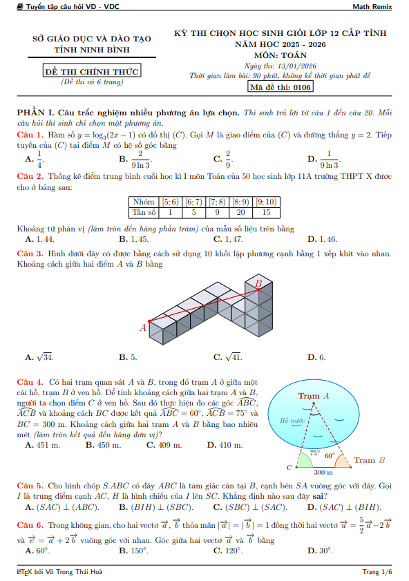 Đề chọn học sinh giỏi tỉnh Toán 12 năm 2025 – 2026 sở GD&ĐT Ninh Bình 14/01/2026