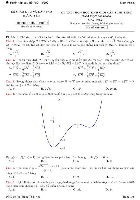 Đề chọn học sinh giỏi tỉnh Toán THPT năm 2025 – 2026 sở GD&ĐT Hưng Yên 14/01/2026