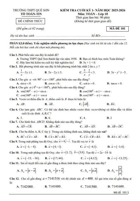 Đề cuối kỳ 1 Toán 10 năm 2025 – 2026 trường THPT Quế Sơn – Đà Nẵng 14/01/2026