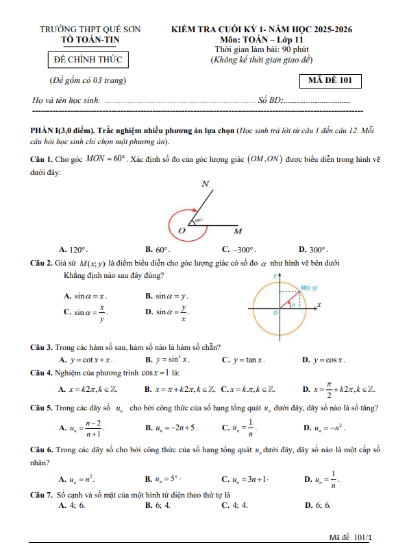 Đề cuối kỳ 1 Toán 11 năm 2025 – 2026 trường THPT Quế Sơn – Đà Nẵng 14/01/2026