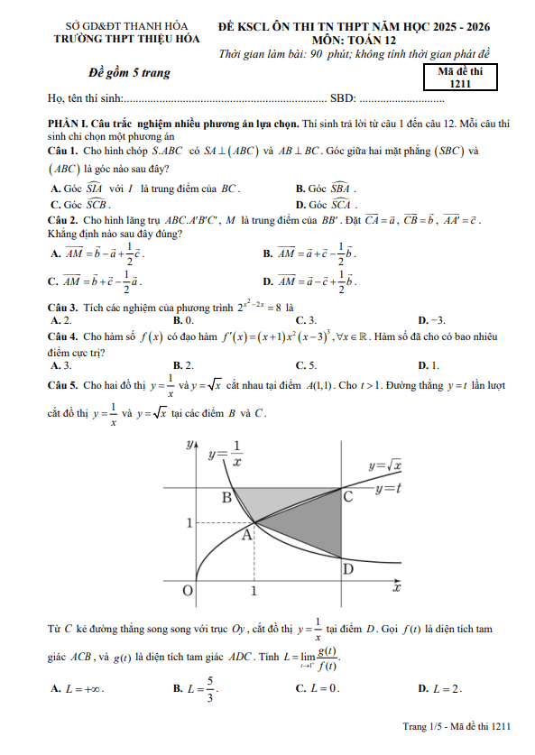 Đề KSCL Toán 12 ôn thi TN THPT 2026 trường THPT Thiệu Hóa – Thanh Hóa 14/01/2026