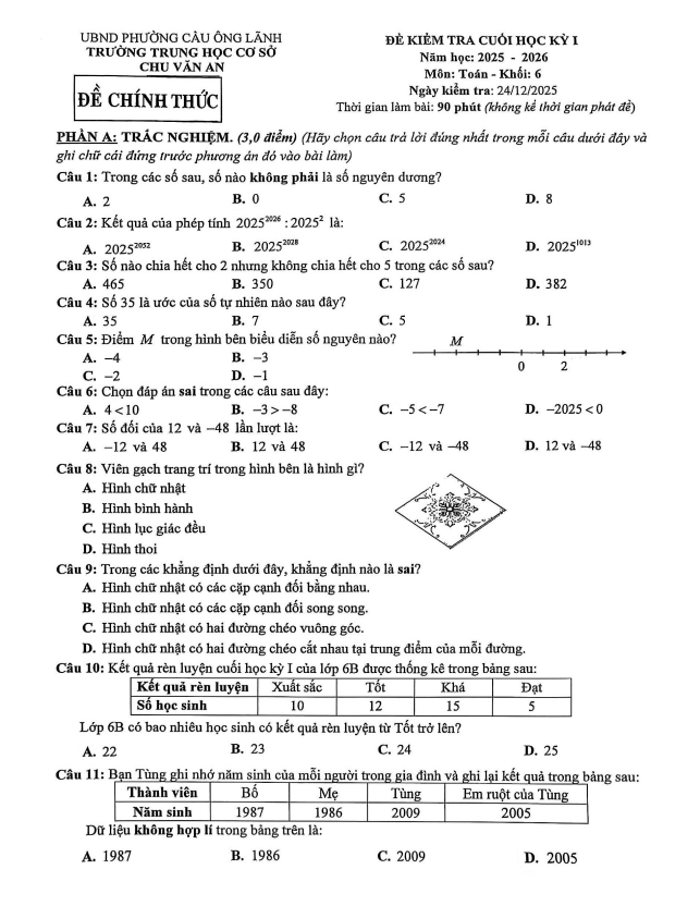 Đề cuối học kỳ 1 Toán 6 năm 2025 – 2026 trường THCS Chu Văn An – TP HCM 31/12/2025