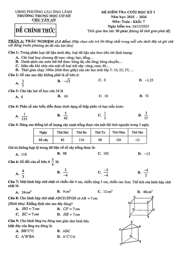 Đề cuối học kỳ 1 Toán 7 năm 2025 – 2026 trường THCS Chu Văn An – TP HCM 31/12/2025