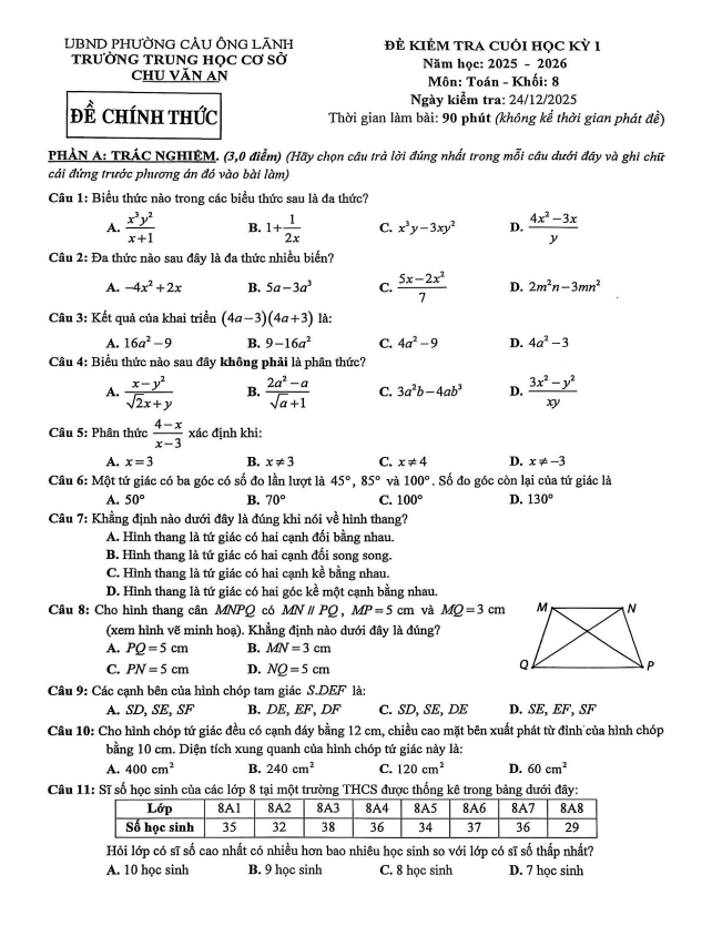 Đề cuối học kỳ 1 Toán 8 năm 2025 – 2026 trường THCS Chu Văn An – TP HCM 31/12/2025