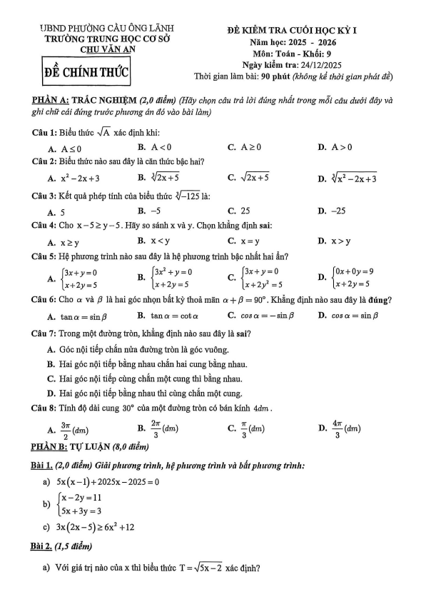 Đề cuối học kỳ 1 Toán 9 năm 2025 – 2026 trường THCS Chu Văn An – TP HCM 31/12/2025