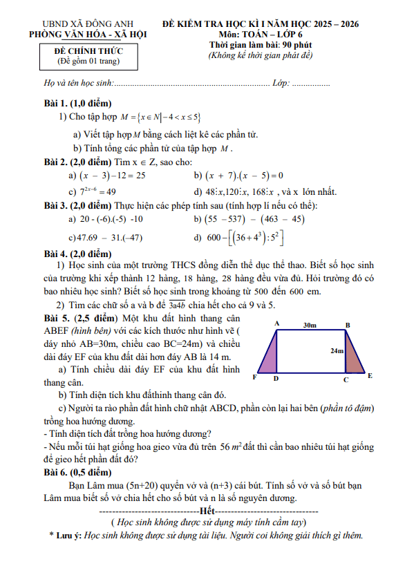 Đề học kì 1 Toán 6 năm 2025 – 2026 xã Đông Anh – Hà Nội 31/12/2025