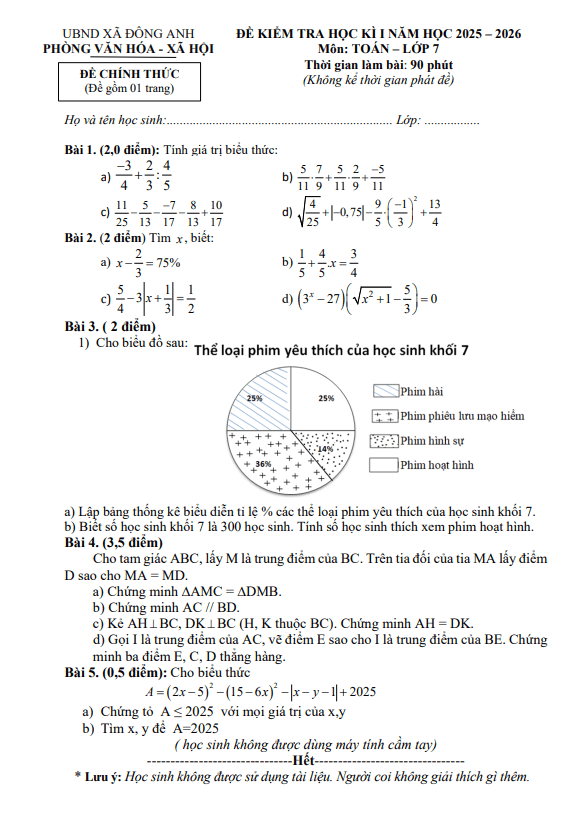 Đề học kì 1 Toán 7 năm 2025 – 2026 xã Đông Anh – Hà Nội 31/12/2025