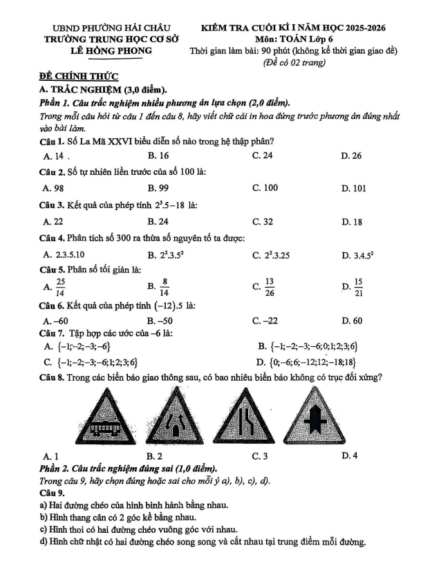Đề cuối kì 1 Toán 6 năm 2025 – 2026 trường THCS Lê Hồng Phong – Đà Nẵng 02/01/2026