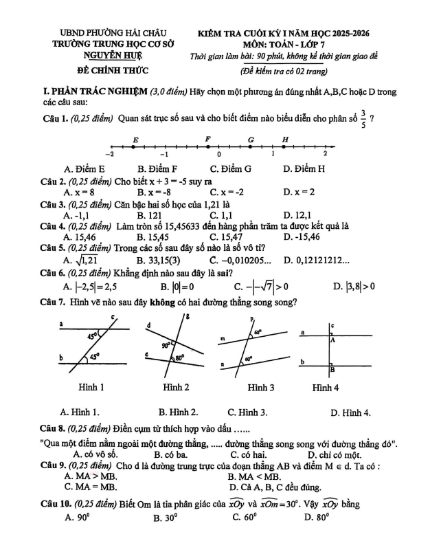 Đề cuối kỳ 1 Toán 7 năm 2025 – 2026 trường THCS Nguyễn Huệ – Đà Nẵng 02/01/2026