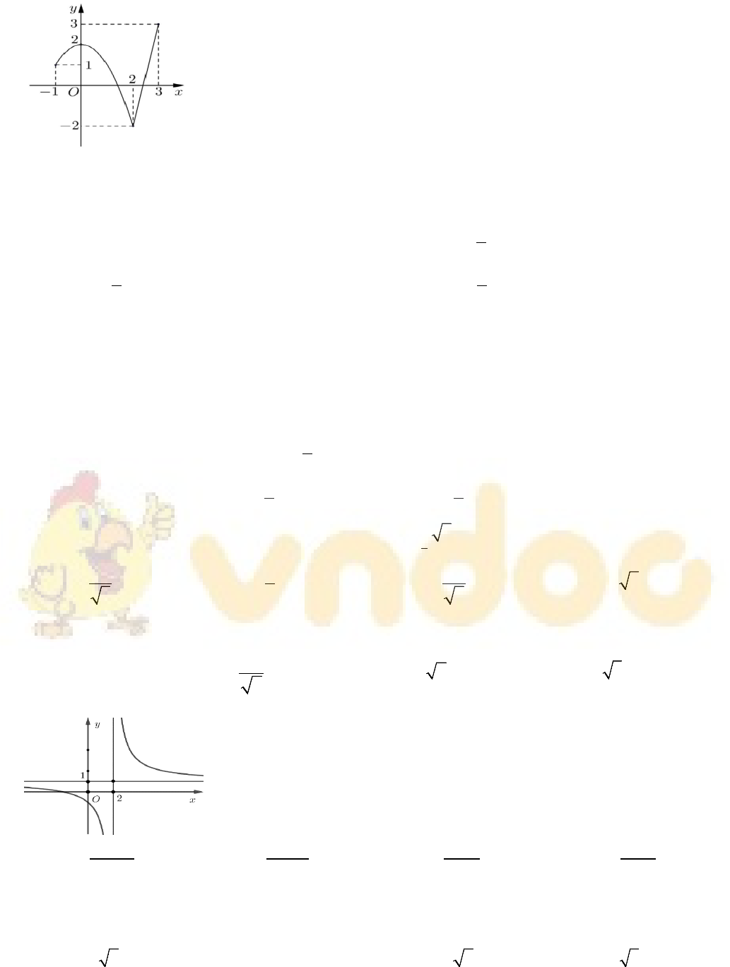 Trang 2/6 - Mã đề thi 001 Hỏi phương trình 7()50fx−= có bao nhiêu nghiệm trên đoạn [1;3]− ? A. 3. B. 2. C. 1. D. 0. Câu 11: Họ tất cả các nguyên hàm của hàm số 2()sinfxxx=+ là A. 3cos3xxC++. B. 31cos3xxC−++. C. 31cos3xxC++. D. 31cos3xx−+. Câu 12: Cho ()fx là một hàm số liên tục trên []2;5− và ()()53218,3fxdxfxdx−==−∫∫. Tính ()()1523.Pfxdxfxdx−=+∫∫ A. 5.P=− B. 11.P= C. 11.P=− D. 5.P= Câu 13: Cho cấp số nhân()nuvới113u=và 49u=−. Công bội của cấp số nhân đã cho bằng: A. 3q=. B. 13q=. C. 13q=−. D. 3q=−. Câu 14: Nghiệm của phương trình 24 12logloglog3xx+= là: A. 313x= B. 13x= C. 13x= D. 33x= Câu 15: Cho khối chóp .SABCD có thể tích bằng 3a, đáy ABCD là hình vuông . Biết chiều cao của khối chóp là 3ha=. Cạnh hình vuông ABCD bằng: A. a. B. 3a. C. 2a. D. 3a. Câu 16: Đồ thị của hàm số nào dưới đây có dạng đường cong trong hình vẽ bên? A. 22xyx−+=+. B. 12xyx−+=−. C. 22xyx+=−. D. 22xyx−=+. Câu 17: Trong không gian, cho hình chữ nhật ABCD có ABa=, 2ACa=. Khi quay hình chữ nhậtABCD quanh cạnh AD thì đường gấp khúc ABCD tạo thành một hình trụ. Diện tích xung quanh của hình trụ đó bằng: A. 225aπ. B. 24aπ. C. 223aπ. D. 23aπ. Câu 18: Hàm số()267xfx+=có đạo hàm là: A. ()()22567.xfxx+′=+ B. ()267ln7.xfx+′= C. ()()22667ln7.xfxx+′=+ D. ()2627ln7.xfxx+′= Câu 19: Có bao nhiêu số tự nhiên có hai chữ số khác nhau mà các chữ số được lấy từ tập hợp Tải tài liệu miễn phí https://vndoc.com