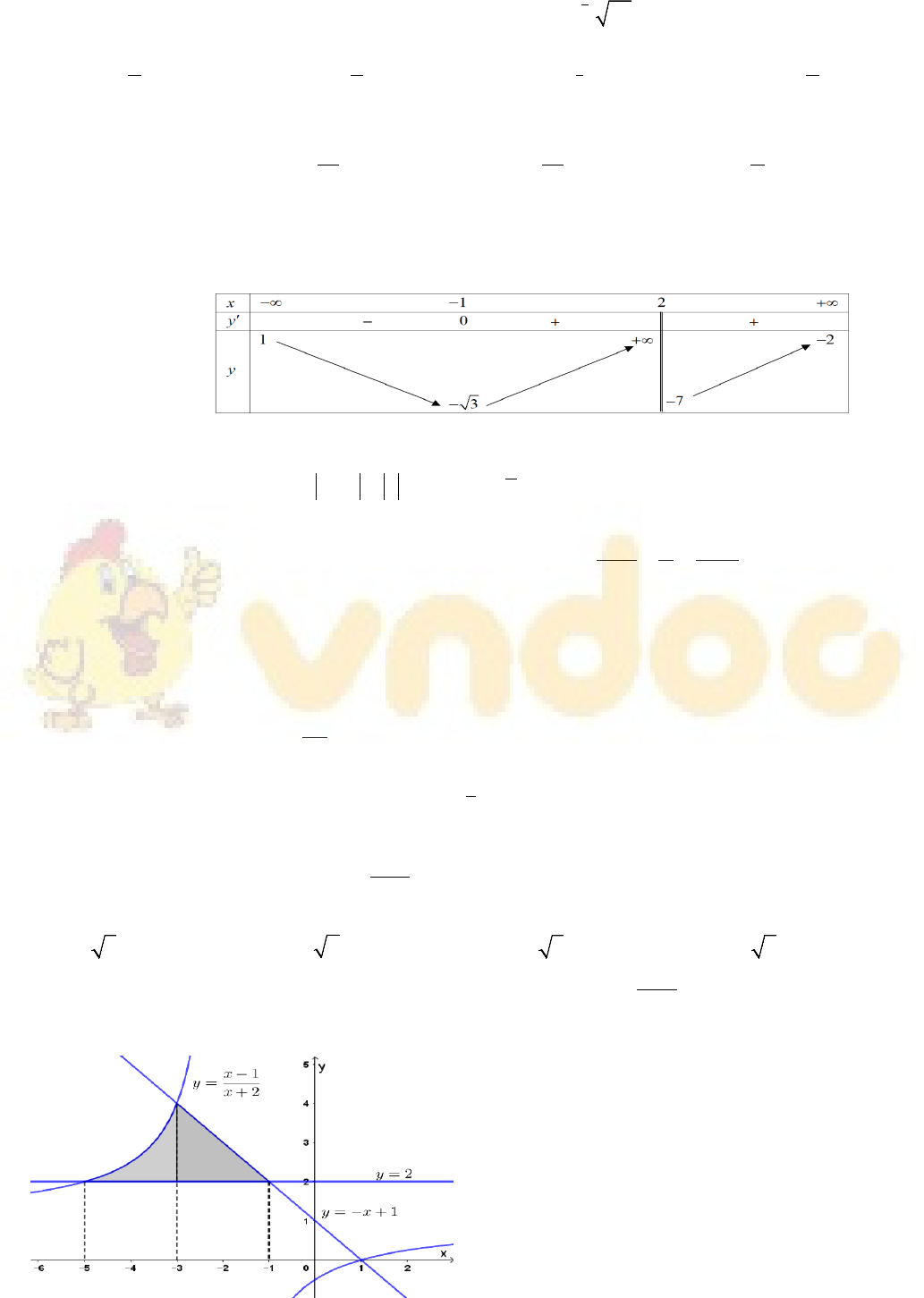 Trang 3/6 - Mã đề thi 001 X = { 1; 2; 3; 4; 5; 6; 7; 8}? A. 28.C B. 28. C. 28.A D. 82. Câu 20: Cho a là một số thực dương. Viết biểu thức 3325.Paa= dưới dạng lũy thừa với số mũ hữu tỉ. A. 1915.Pa= B. 115.Pa= C. 25.Pa= D. 115.Pa−= Câu 21: Tìm phần ảo của số phức z thỏa mãn ()357izi+=− A. 3. B. 135i−. C. 135−. D. 45. Câu 22: Số nghiệm nguyên của bất phương trình()()1.ln50xx−−> là: A. 3. B. 2. C. 1. D. 4. Câu 23: Cho hàm số()yfx= có bảng biến thiên như sau Tổng số đường tiệm cận đứng và tiệm cận ngang của đồ thị hàm số đã cho là: A. 3. B. 2. C. 4. D. 1. Câu 24: Số phức z thỏa mãn 2zz−= và ()()1zzi+− là số thực. Giá trị của zlà: A. 12i+. B. 12i−−. C. 2i−. D. 12i−. Câu 25: Trong không gian Oxyz, cho đường thẳng thẳng 12:211+−==xyzd. Viết phương trình mặt phẳng ()P chứa đường thẳng d song song với trục Ox. A. ():220Pxz−−=. B. ():20Pyz+−=. C. ():210Pxy−+=. D. ():20−+=Pyz. Câu 26: Cho hàm số ()432020.2xfxxx=+−+ Số điểm cực trị của hàm số ()fx là: A. 4. B. 3. C. 2. D. 1. Câu 27: Cho số phức zabi=+ thỏa mãn 23zzi+=+. Giá trị của biểu thức 3ab+ là: A. 5. B. 6. C. 4. D. 3. Câu 28: Đồ thị ()C của hàm số 11xyx+=− và đường thẳng :d21yx=− cắt nhau tại hai điểm A và B khi đó độ dài đoạn AB bằng: A. 25. B. 22. C. 23. D. 5. Câu 29: Cho hình phẳng ()H giới hạn bởi đồ thị hàm số 12xyx−=+ và hai đường thẳng 2y=, 1yx=−+ (phần tô đậm trong hình vẽ). Tính diện tích S của hình phẳng ()H. Tải tài liệu miễn phí https://vndoc.com Đề thi thử tốt nghiệp THPT quốc gia 2020 môn Toán cụm trường THPT Ninh Bình, Hoa Lư lần 2