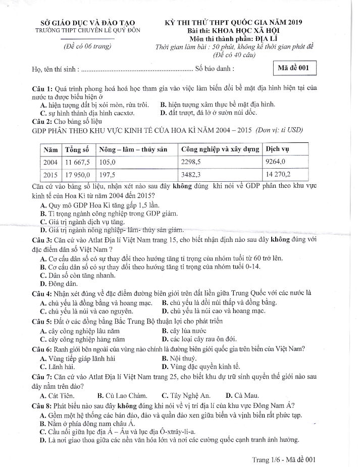 Đề thi thử THPTQG Địa lí lần 1 năm 2019 trường chuyên Lê Quý Đôn – Quảng Trị