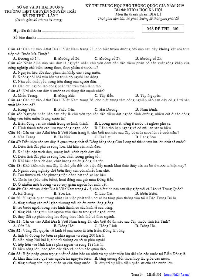 Đề thi thử Địa lí THPTQG 2019 lần 1 trường chuyên Nguyễn Trãi – Hải Dương