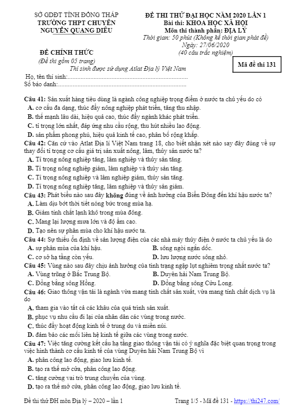 Đề thi thử Đại học năm 2020 môn Địa lý lần 1 trường chuyên Nguyễn Quang Diêu – Đồng ThápTÌM KIẾM
