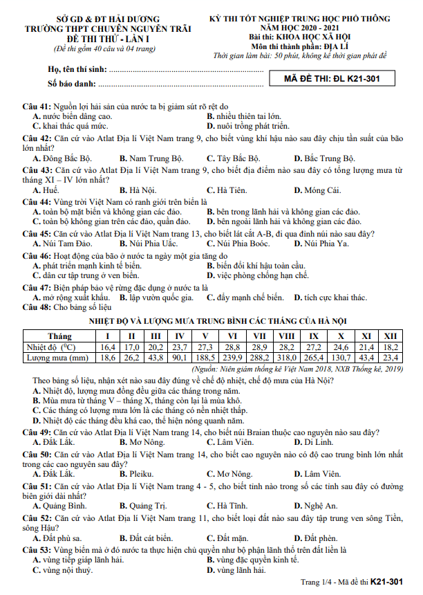 Đề thi thử Địa lí TN THPT 2021 lần 1 trường chuyên Nguyễn Trãi – Hải Dương