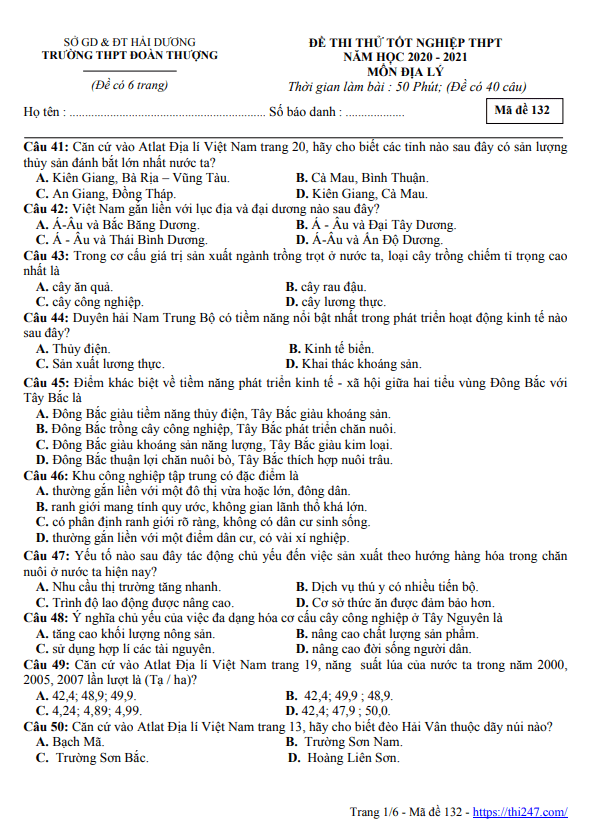 Đề thi thử THPTQG 2021 môn Địa lý lần 1 trường Đoàn Thượng – Hải Dương