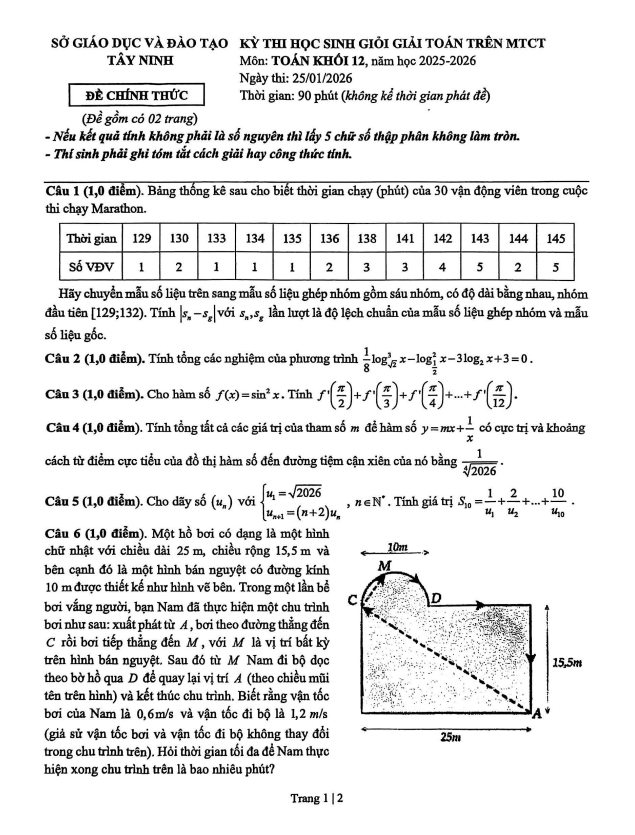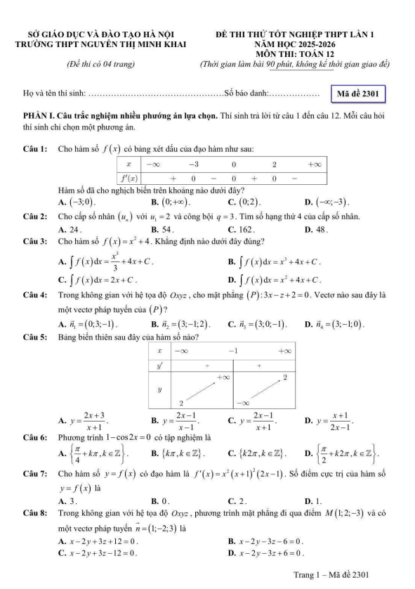 Đề thi thử TN THPT 2026 lần 1 môn Toán trường THPT Nguyễn Thị Minh Khai – Hà Nội