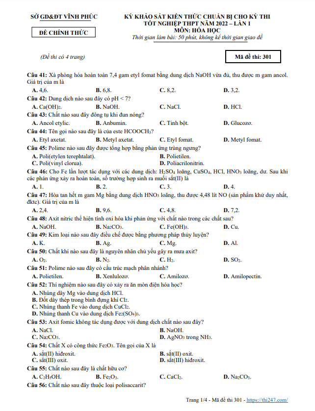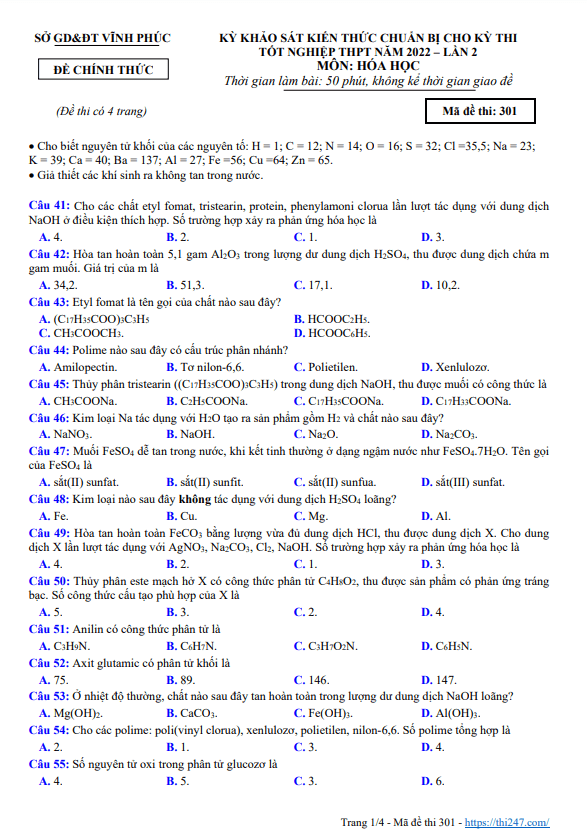 Đề thi thử tốt nghiệp THPT 2022 môn Hóa học lần 1 sở GD&ĐT Vĩnh Phúc