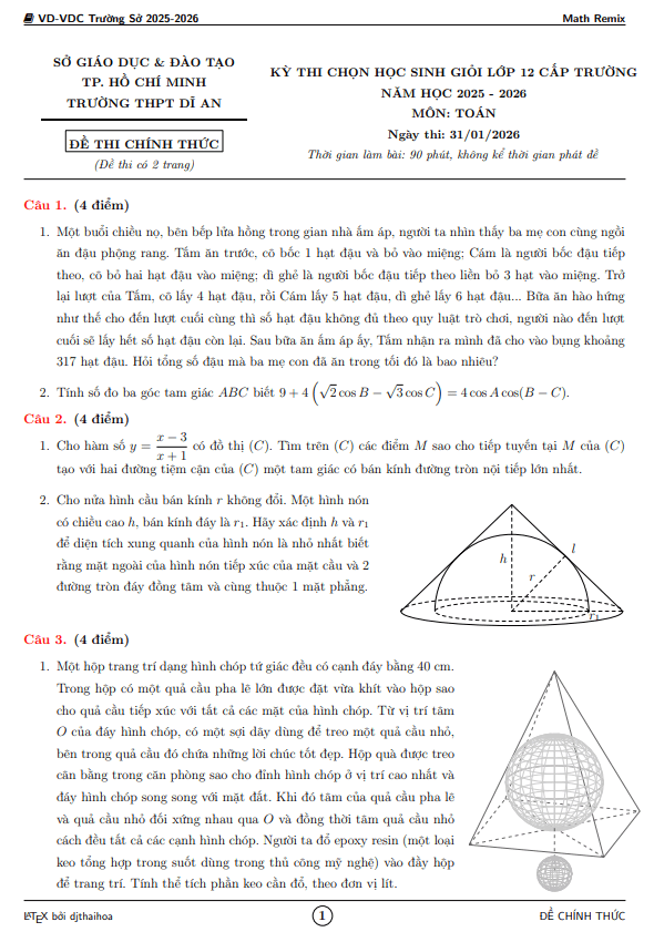 Trích dẫn đề thi thử tốt nghiệp THPT 2022 môn Toán liên trường THPT – Nghệ An: + Một hình nón có chiều cao h 4; độ dài đường sinh l 5. Một mặt phẳng đi qua đỉnh của hình nón và cắt đường tròn đáy theo một dây cung có độ dài bằng 2 5. Khoảng cách từ tâm của đáy đến mặt phẳng đó bằng? + Nếu tăng bán kính của một khối cầu gấp 2 lần thì thể tích thay đổi như thế nào? A. Thể tích tăng gấp 4 lần. B. Thể tích tăng gấp 4 3 lần. C. Thể tích tăng gấp 8 lần. D. Thể tích tăng gấp 2 lần. + Một lớp có 20 nam sinh và 15 nữ sinh. Giáo viên chọn ngẫu nhiên 4 học sinh đi test Covid. Tính xác suất để 4 học sinh được chọn có cả nam và nữ.