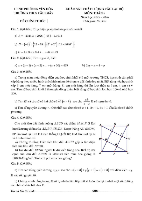 Đề khảo sát CLB Toán 6 năm 2025 – 2026 trường THCS Cầu Giấy – Hà Nội 17/01/2026
