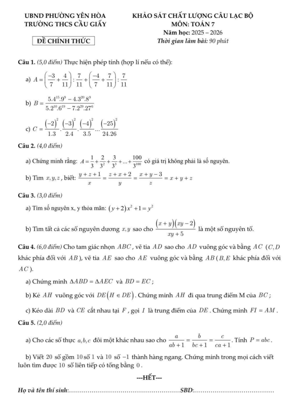 Đề khảo sát CLB Toán 7 năm 2025 – 2026 trường THCS Cầu Giấy – Hà Nội 17/01/2026