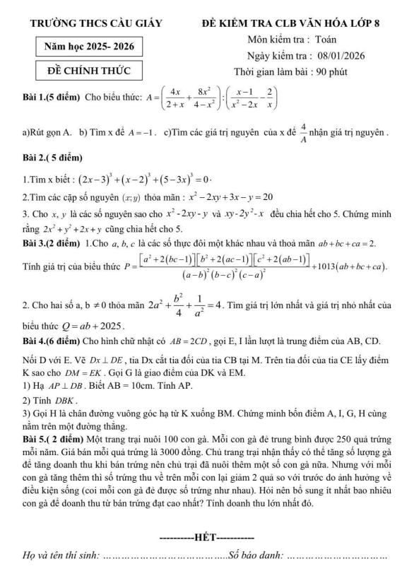 Đề khảo sát CLB Toán 8 năm 2025 – 2026 trường THCS Cầu Giấy – Hà Nội 17/01/2026