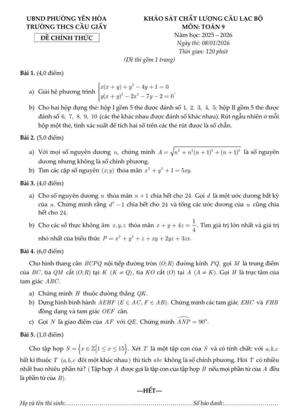Đề khảo sát CLB Toán 9 năm 2025 – 2026 trường THCS Cầu Giấy – Hà Nội 17/01/2026