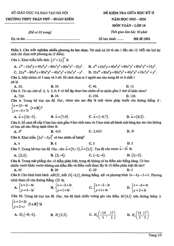 Đề giữa học kỳ 2 Toán 10 năm 2025 – 2026 trường THPT Trần Phú – Hà Nội 12/03/2026