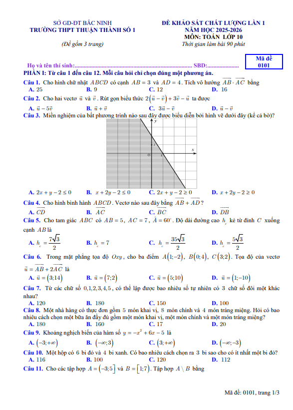 Đề khảo sát Toán 10 lần 1 năm 2025 – 2026 trường THPT Thuận Thành 1 – Bắc Ninh 12/03/2026