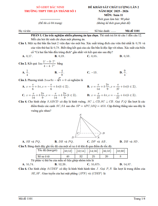 Đề khảo sát Toán 11 lần 2 năm 2025 – 2026 trường THPT Thuận Thành 1 – Bắc Ninh 12/03/2026