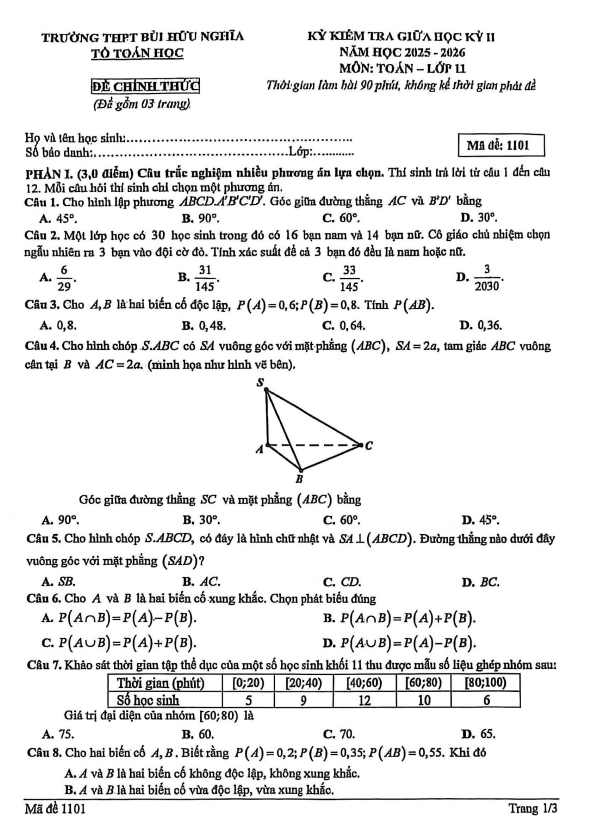 Đề giữa kỳ 2 Toán 11 năm 2025 – 2026 trường THPT Bùi Hữu Nghĩa – Cần Thơ 08/03/2026