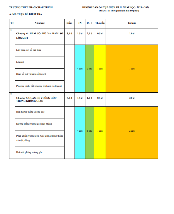 Ôn tập giữa kì 2 Toán 11 năm 2025 – 2026 trường THPT Phan Châu Trinh – Đà Nẵng 08/03/2026