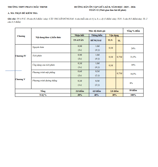 Ôn tập giữa kì 2 Toán 12 năm 2025 – 2026 trường THPT Phan Châu Trinh – Đà Nẵng 08/03/2026