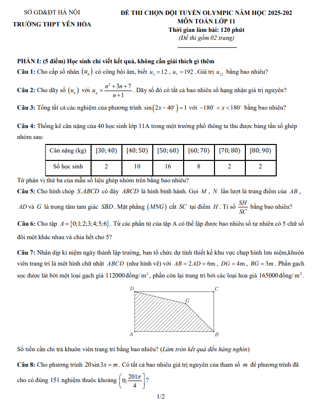 Đề chọn đội tuyển Olympic Toán 11 năm 2025 – 2026 trường THPT Yên Hòa – Hà Nội 05/03/2026