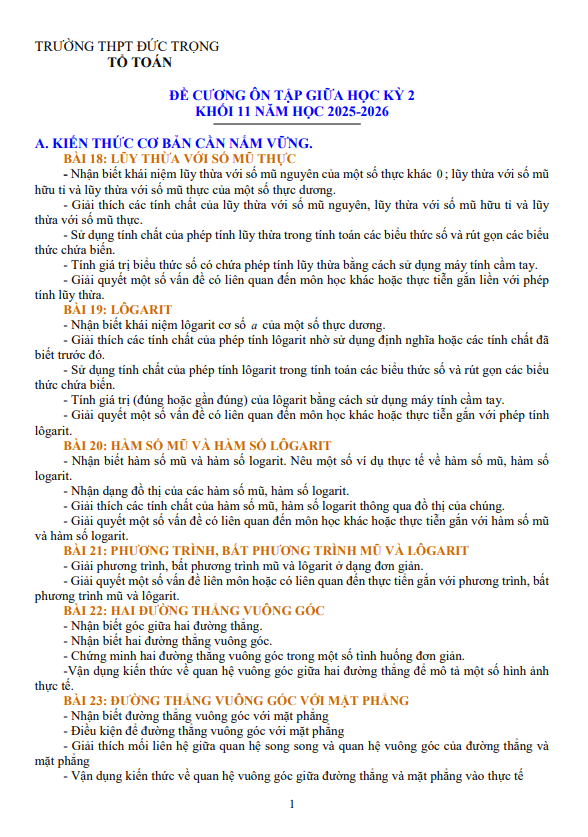 Đề cương giữa kỳ 2 Toán 11 năm 2025 – 2026 trường THPT Đức Trọng – Lâm Đồng 10/03/2026