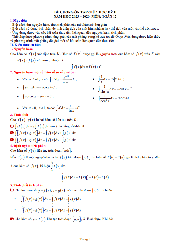 Đề cương giữa kỳ 2 Toán 12 năm 2025 – 2026 trường THPT Đức Trọng – Lâm Đồng 10/03/2026